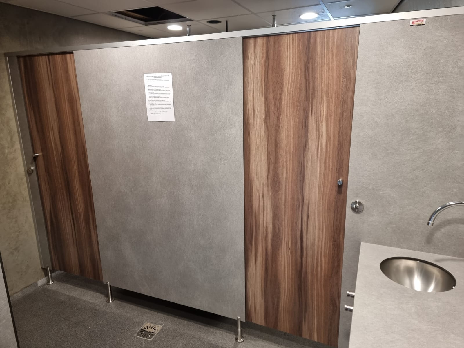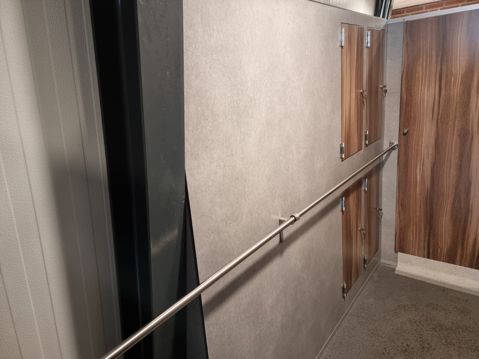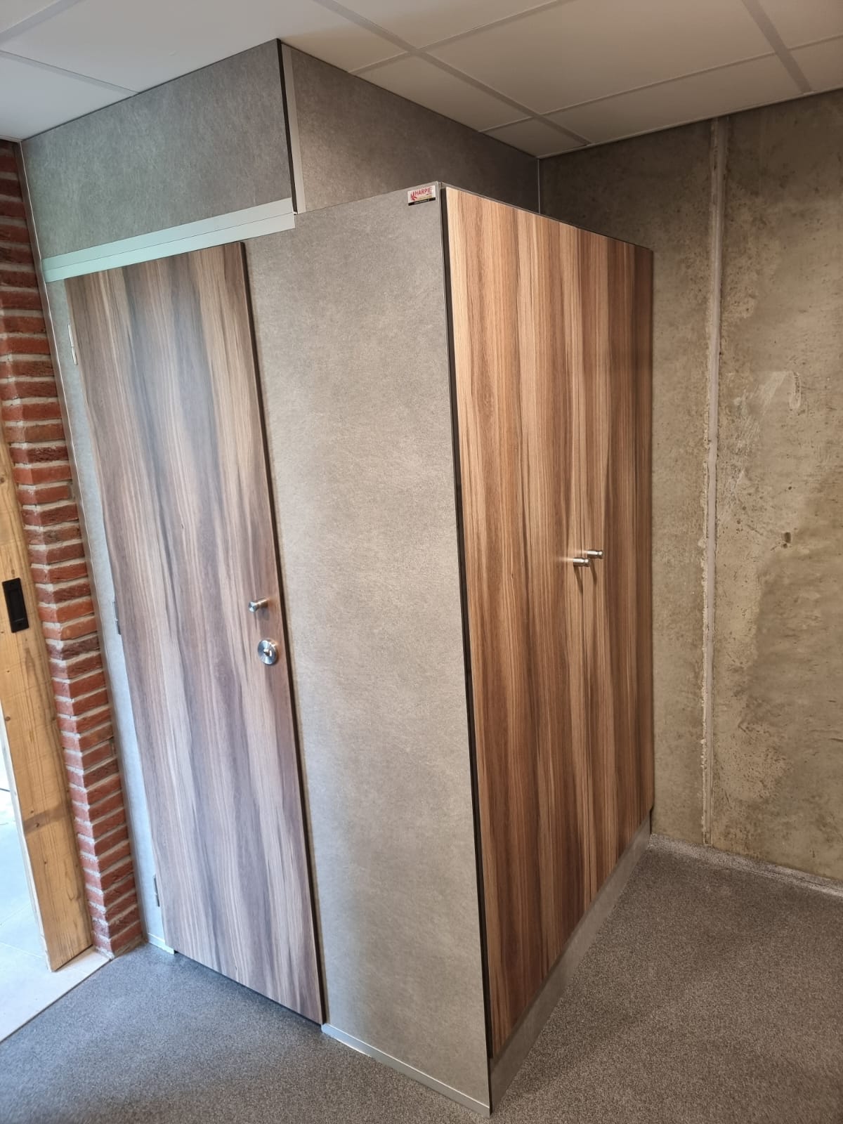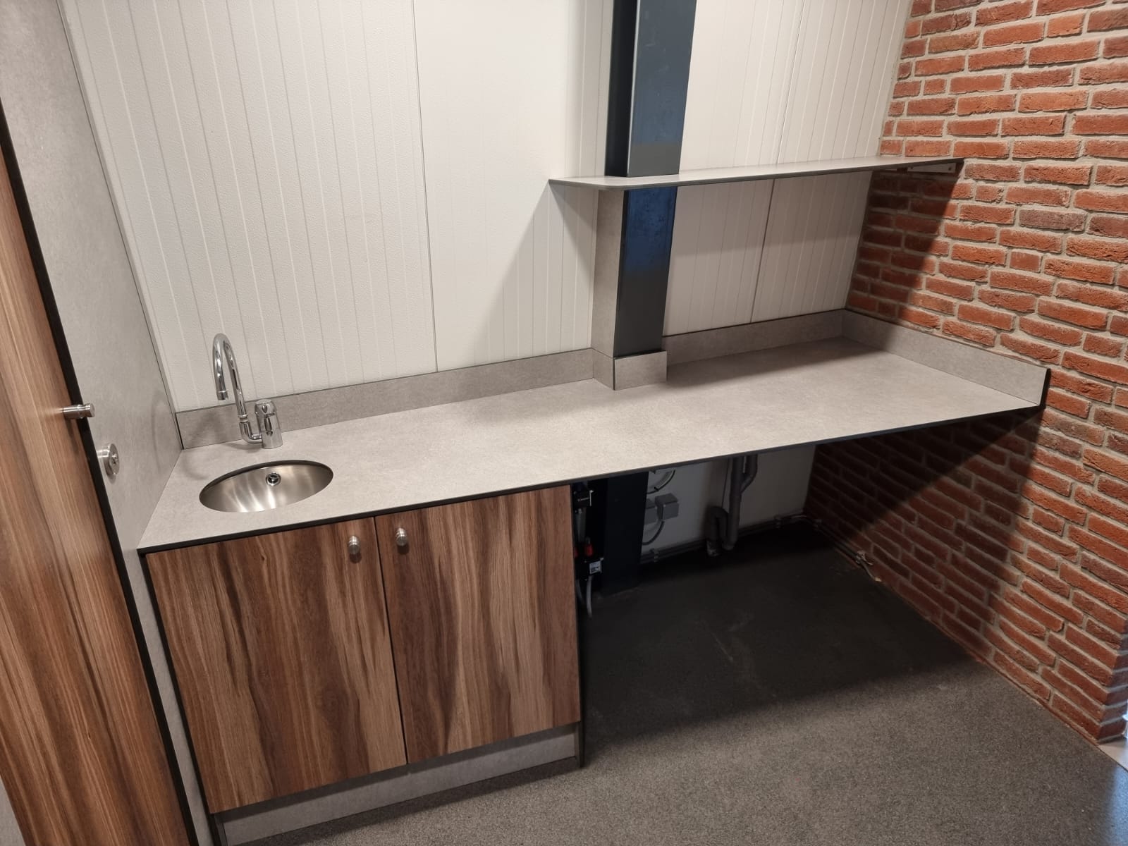 De hygiënesluis van Harpie is een echte eye-catcher en het visitekaartje van het bedrijf. De douches zijn voorzien van een vuillinnenkast waar de gedragen kleding gedeponeerd kan worden. Ook zijn er Trespa lockers geïntegreerd in een van de zijwanden. Het keukenblokje en de toiletcabine zijn in dezelfde kleurstelling vormgegeven en maken het geheel af.