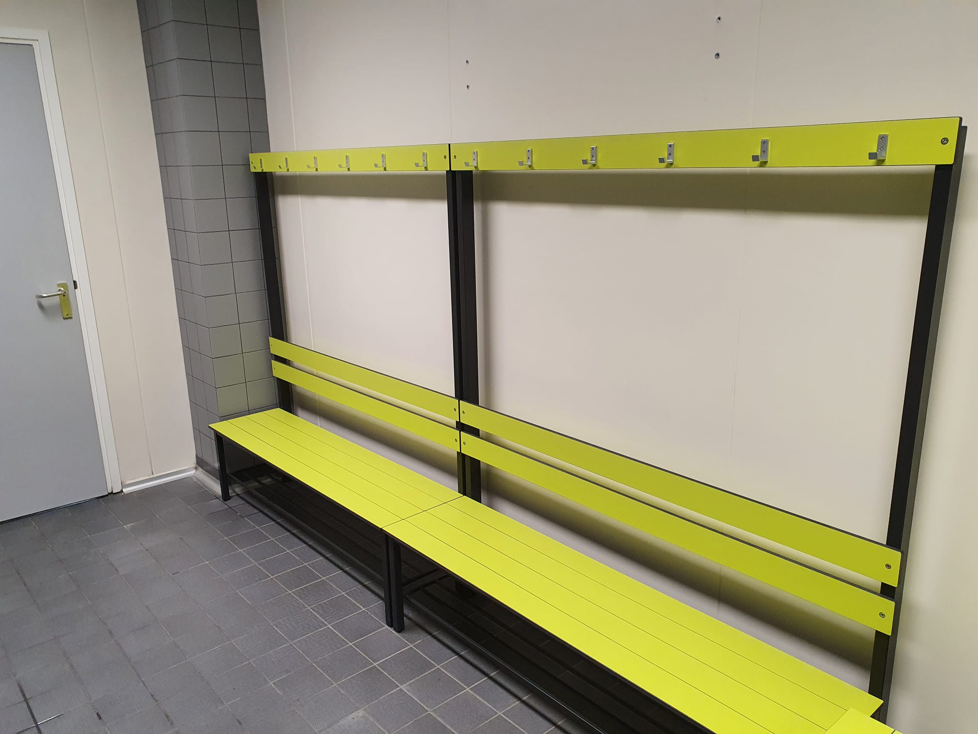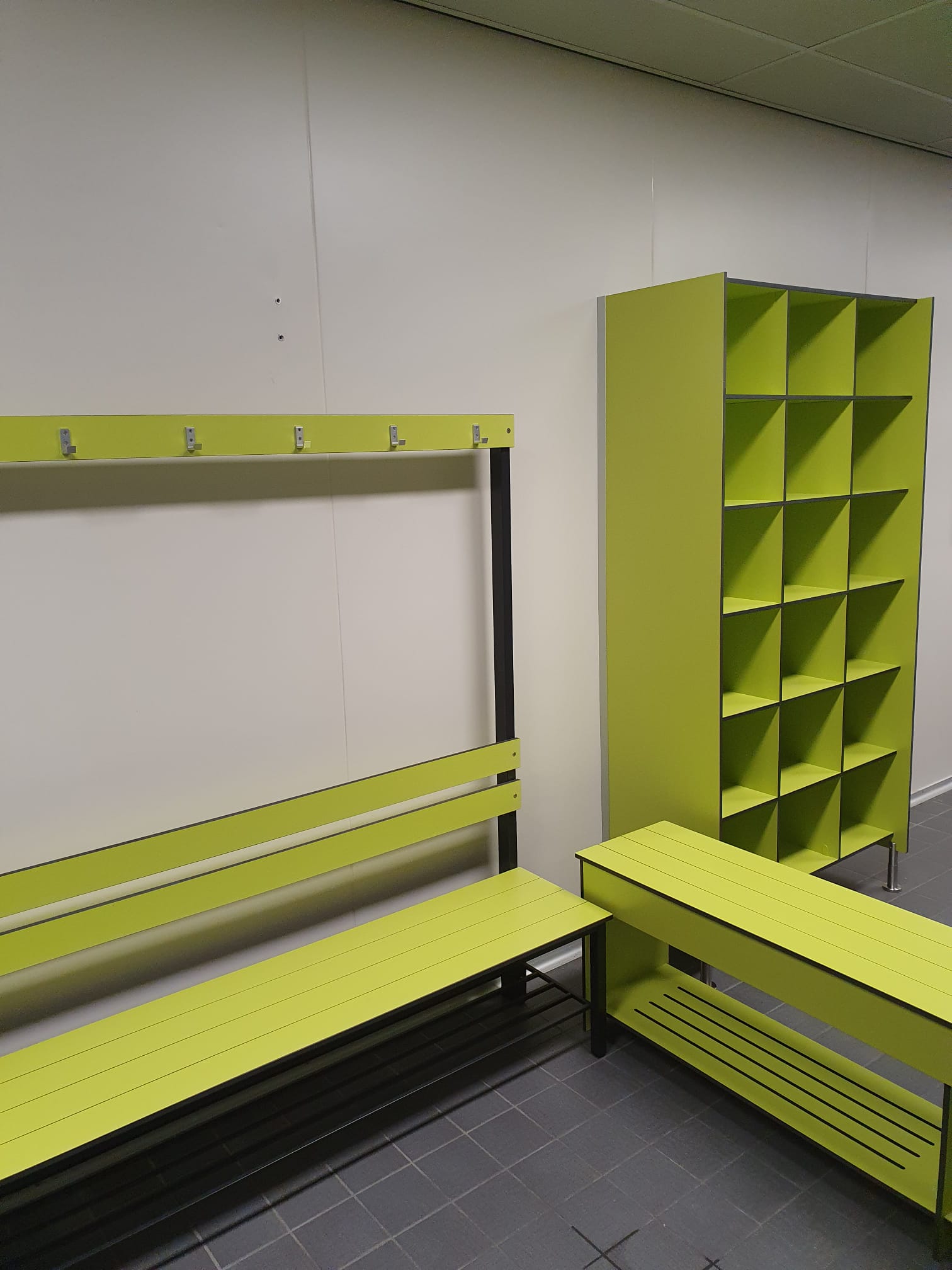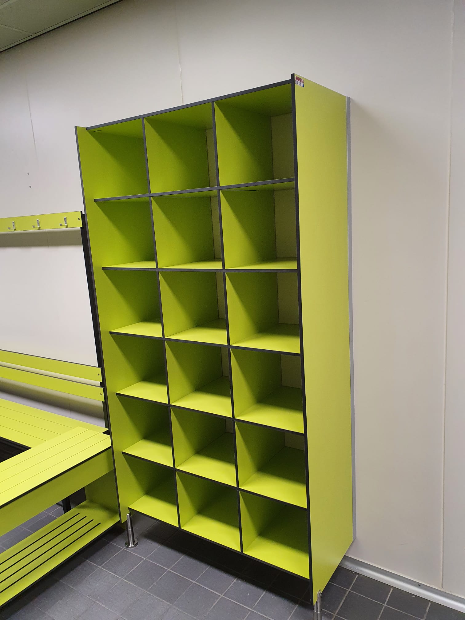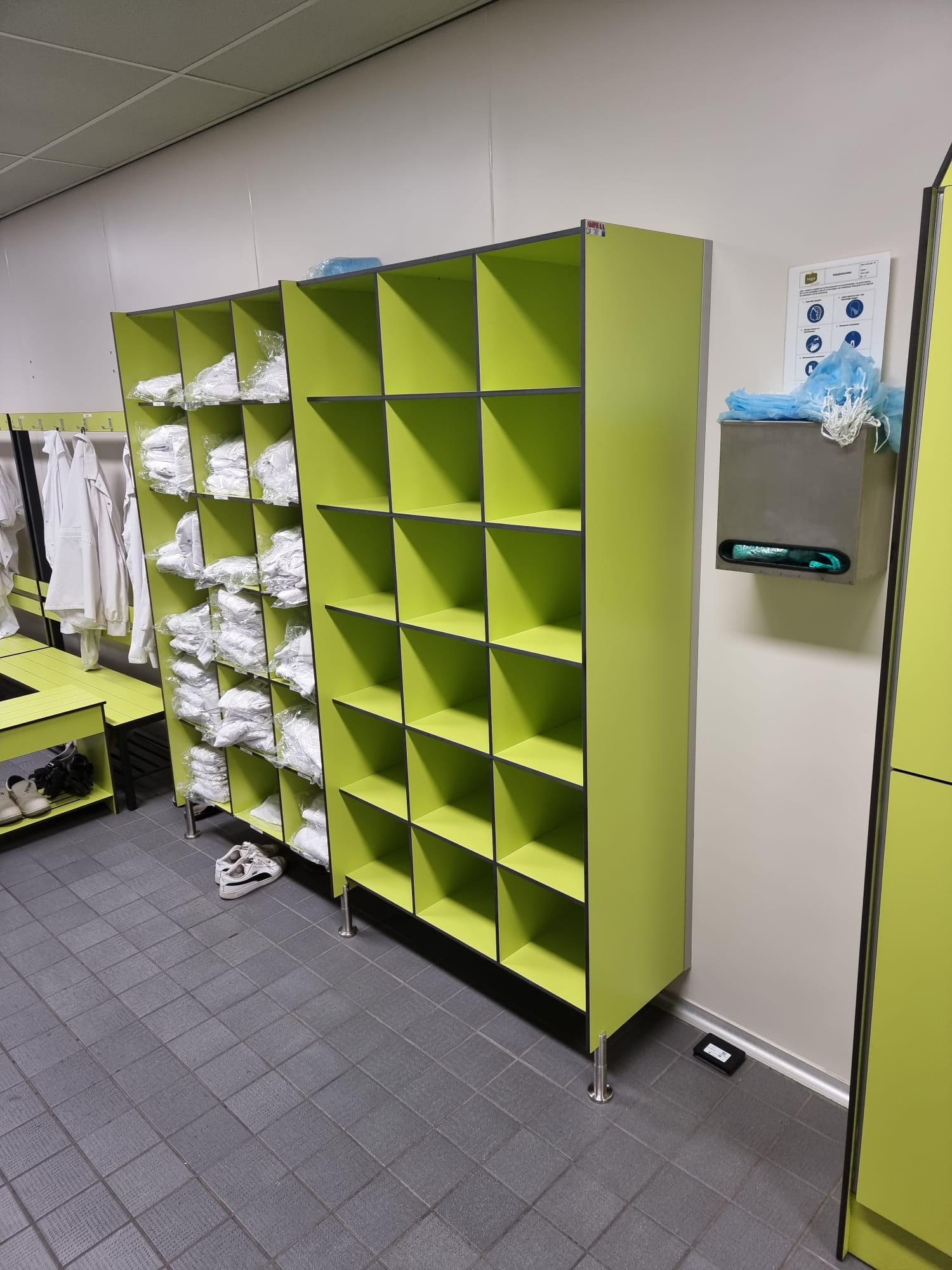 Geplaatst zijn hier lockerkasten, kleding uitgifte kasten, overstapbankjes en zitbanken met schoenenrooster en jashaken. Ook hier hebben we onze sanitaire producten kunnen presenteren én groen geleverd!