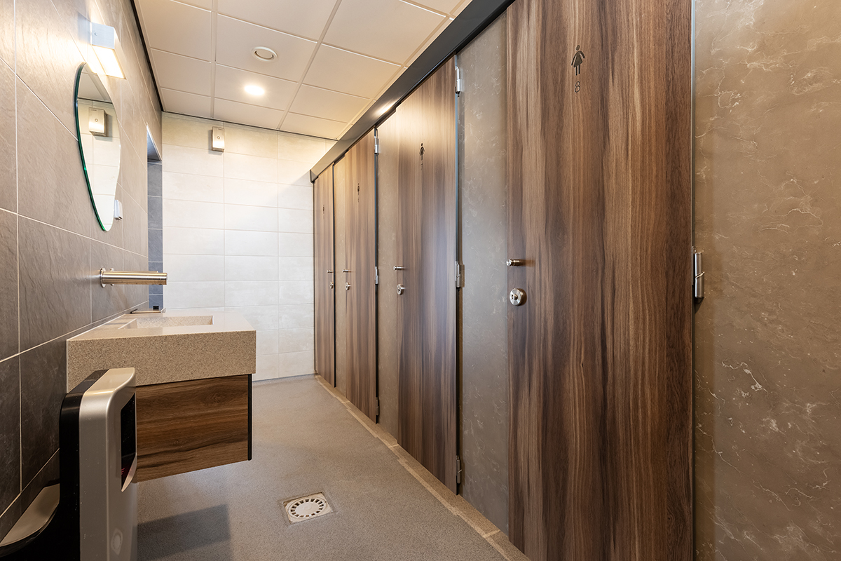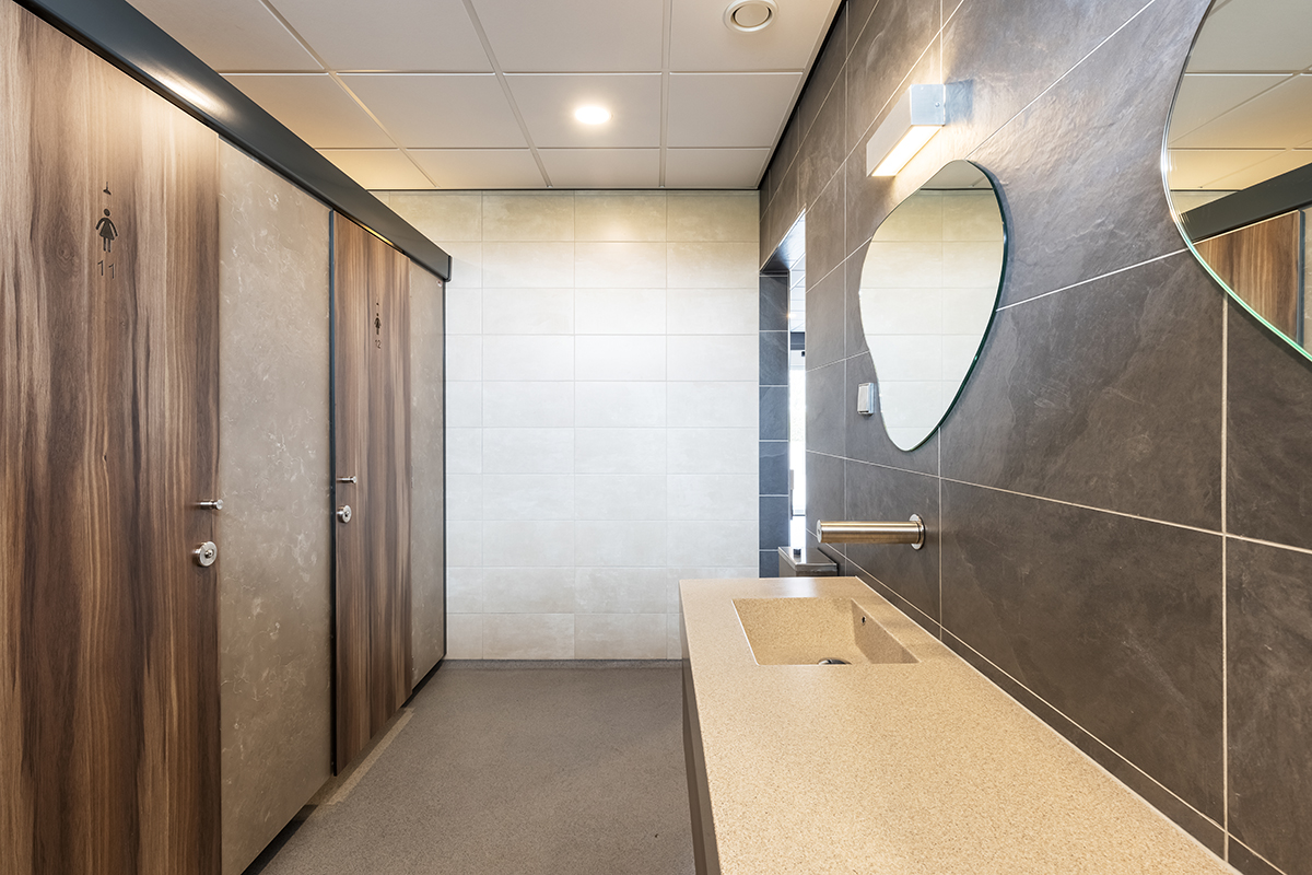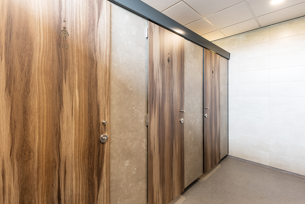 De tussenwanden van de sanitaire cabines zijn aansluitend gemaakt tot op de vloer in verband met maximale privacy. Het voorfront met de cabinedeuren is geheel zwevend en voorzien van een verzwaard bovenprofiel voor stabiliteit in de gehele constructie. De volkern deuren zijn voorzien van pictogrammen welke we met onze laser graveermachine gemaakt hebben. Op wens van de klant hebben we alle profielen antraciet grijs gepoedercoat wat het geheel 100% af maakt.