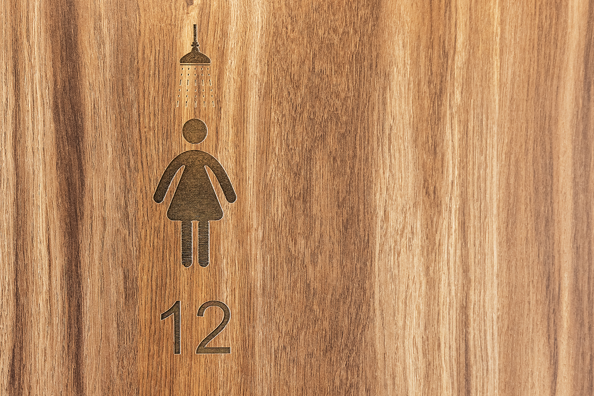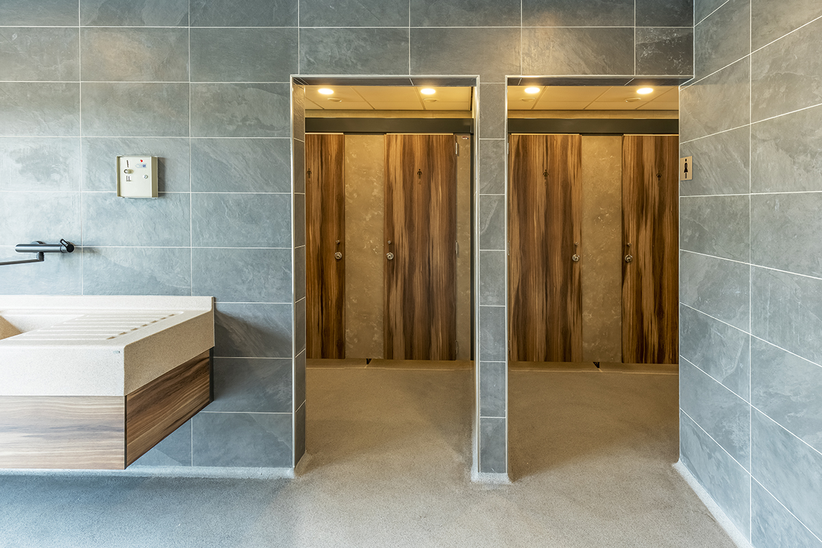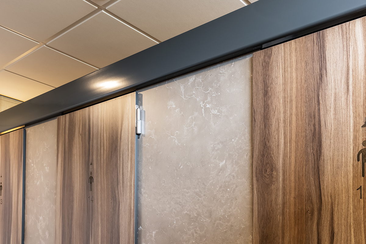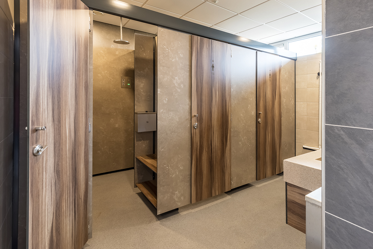 De tussenwanden van de sanitaire cabines zijn aansluitend gemaakt tot op de vloer in verband met maximale privacy. Het voorfront met de cabinedeuren is geheel zwevend en voorzien van een verzwaard bovenprofiel voor stabiliteit in de gehele constructie. De volkern deuren zijn voorzien van pictogrammen welke we met onze laser graveermachine gemaakt hebben. Op wens van de klant hebben we alle profielen antraciet grijs gepoedercoat wat het geheel 100% af maakt.