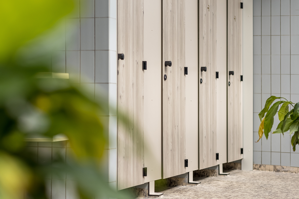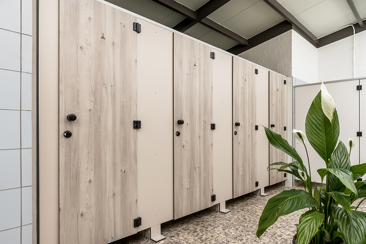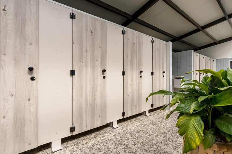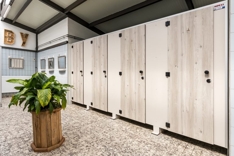 Op dit park zijn er twee sanitaire ruimtes vernieuwd met in totaal 16 toilet, douche en was cabines. Om bouwkundige redenen zijn de gemetselde tussenmuurtjes tussen de cabines blijven staan en heeft Harpie hier het voorfront met cabinedeuren vernieuwd. Oude houten kozijnen hebben hier plaatsgemaakt voor strakke volkern wanden. Doordat de tussenmuurtjes behouden zijn konden we de tussenpanelen hiertegen monteren en zo werken met een pootloos systeem. De gekozen kleurencombinatie geeft je echt het strandgevoel.