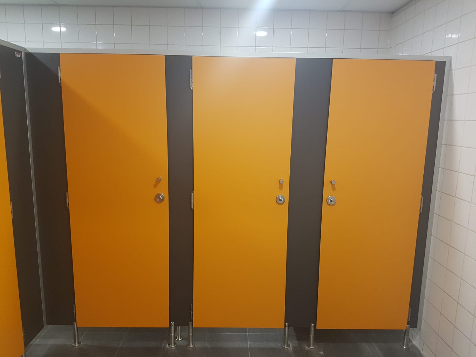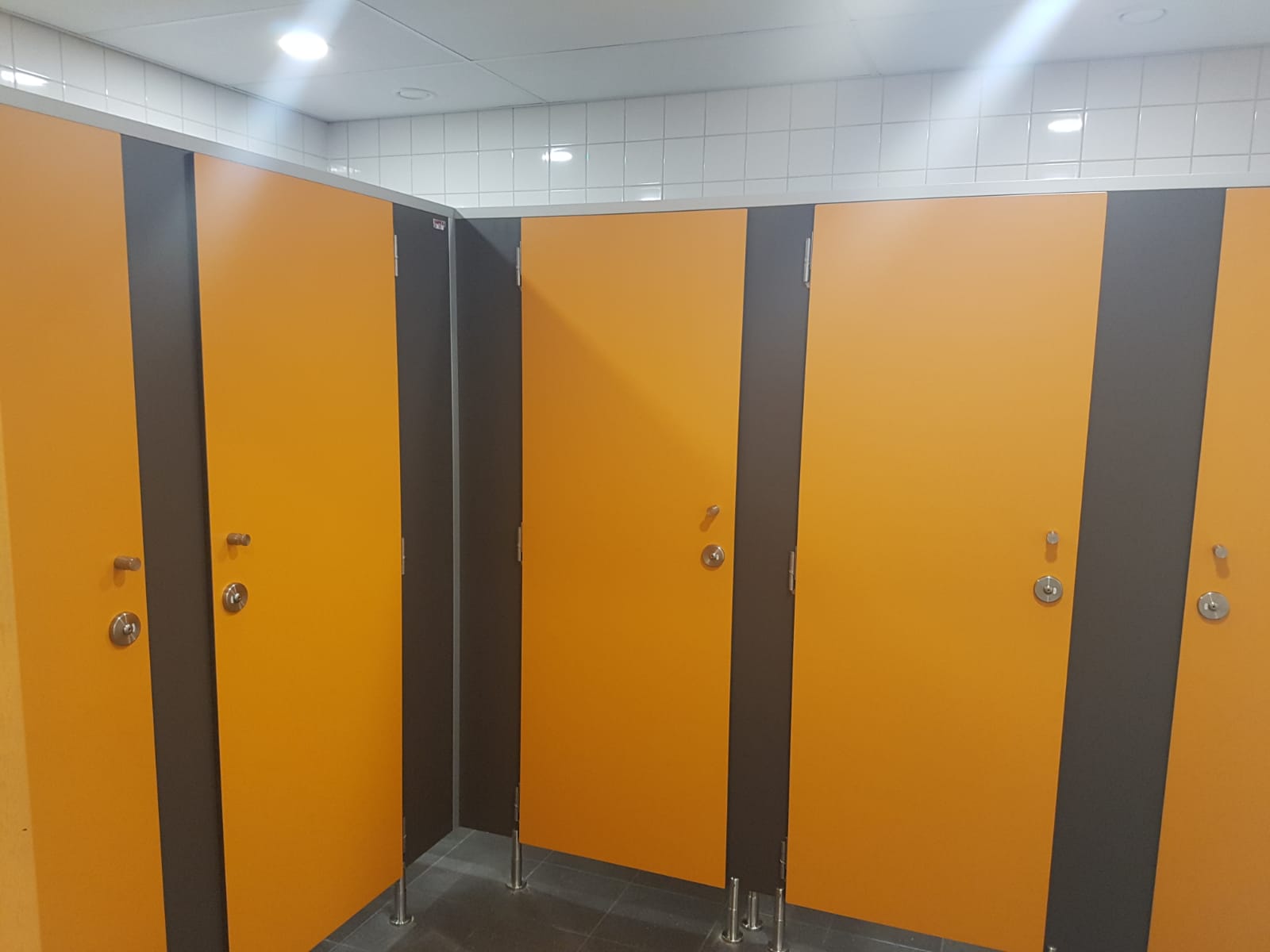 Sanitaire cabines in huisstijl bedrijf geïntegreerd.