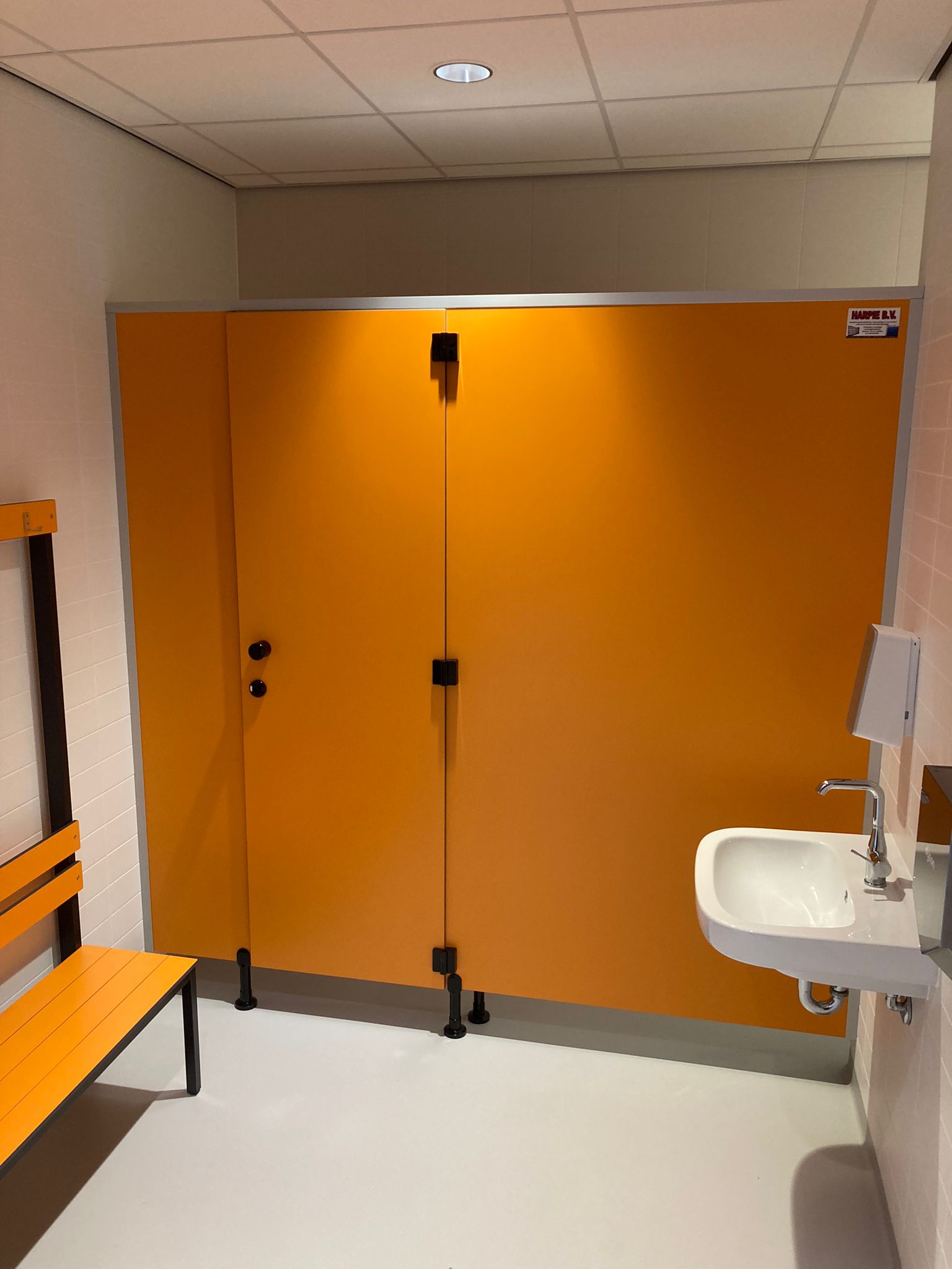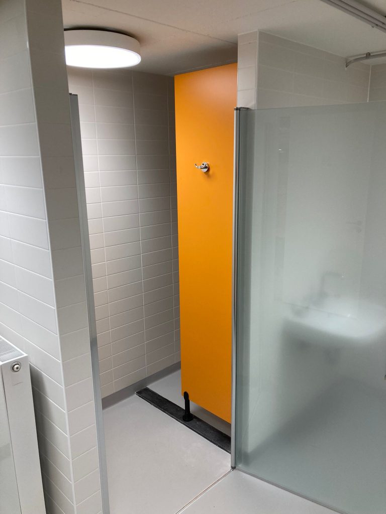 De toilet en douchecabines springen er lekker uit maar sluiten toch prachtig aan op het geheel doordat ook de bestaande toegangsdeuren in dezelfde oranje tint zijn uitgevoerd.